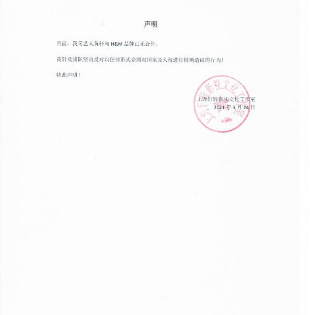 3月24日,黄轩工作室发表声明称,目前黄轩与HM没有任何合作。黄轩和他的团队表示,他们坚决反对任何抹黑国家和人权的企图。