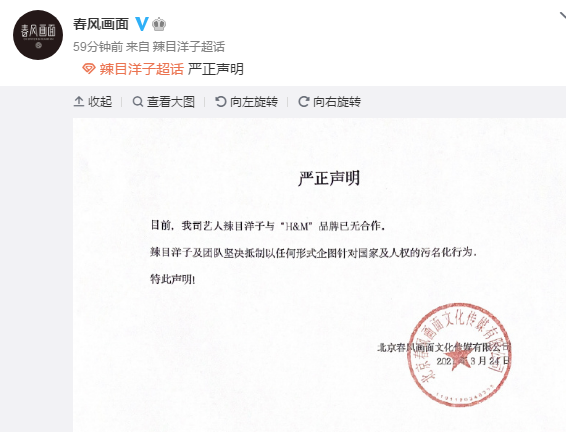 3月24日,春风画面官方微博发布声明称,我司艺人辣目洋子与 “H&M”品牌已无合作。