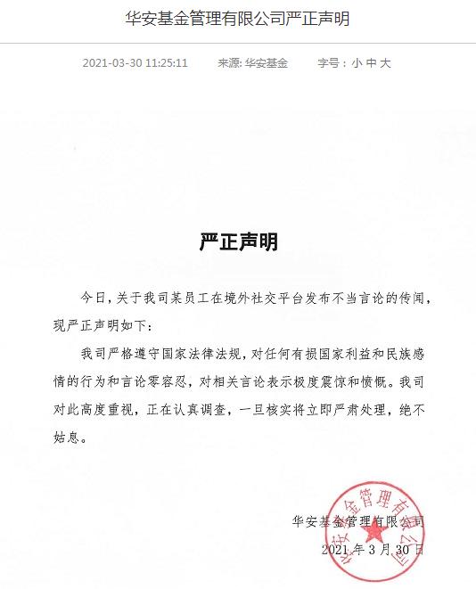 近日,有网友发现,一位自称是“华安基金首席培训师”的女性人员,在国外的社交网站上散发各种不当言论。今天午间,华安基金针对此事发表声明称:“公司严格遵守国家法律法规,对任何有损国家利益和民族感情的行为和言论零容忍,对相关言论表示极度震惊和愤慨。我司对此高度重视,正式认真调查,一旦核实将立即严肃处理,绝不姑息。”