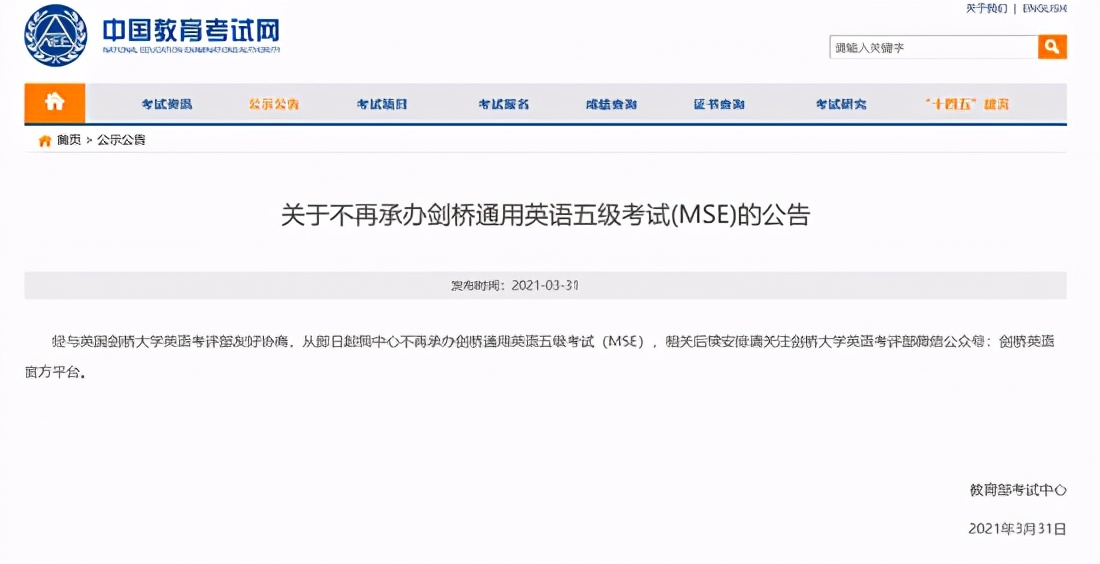 3月31日,教育部考试中心官网发布公告称,即日起,教育部考试中心不再承办剑桥通用英语五级考试(MSE)。
