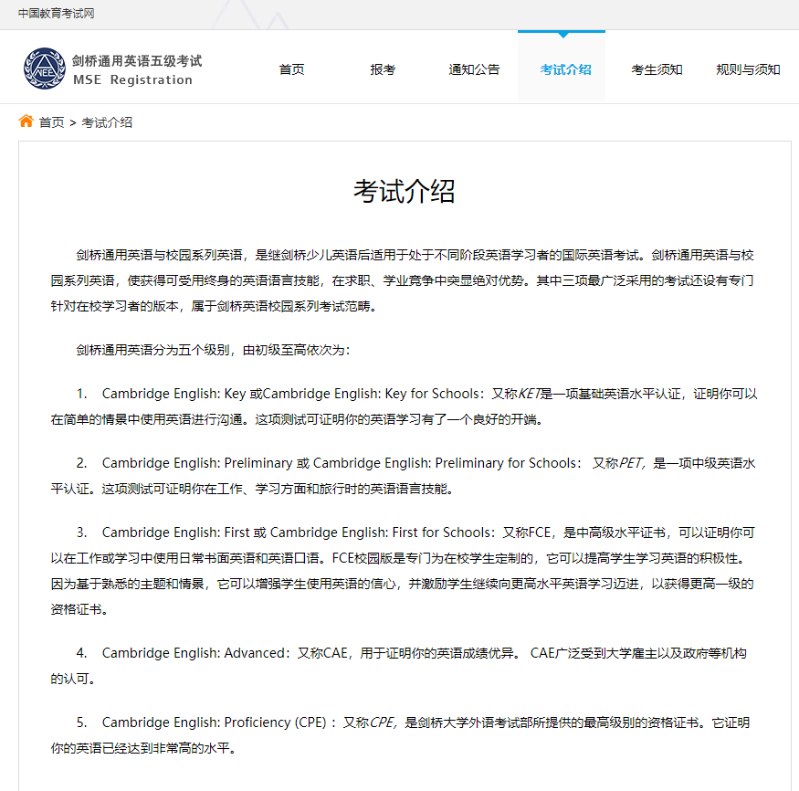 据中国教育考试网发布的《考试介绍》,剑桥通用英语分为五个级别,由初级至高依次为: