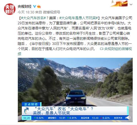 大众汽车美国子公司29日发布的消息称,为了重塑品牌形象,公司将把原名中的字母k换为t。大众汽车在德语中意为“人民的汽车”,而更名是将“人民”改为“伏特”,也就是电压的单位。这份公告称,修改后的名称将于5月生效,彰显了公司将重心转向电动汽车的决心。不过,有关这一消息的新闻稿很快被从公司官网删除。 随后,《华尔街日报》30日下午发布报道称,大众更名的消息是愚人节的一个玩笑,目的在于提高人们对大众电动汽车的认识。