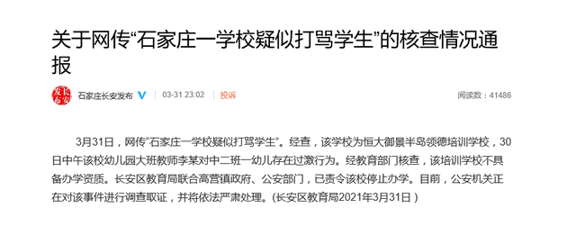 石家庄市长安区教育局昨晚发布了《关于网传“石家庄一学校疑似打骂学生”的核查情况通报》,通报称,3月31日,网传“石家庄一学校疑似打骂学生”。经查,该学校为恒大御景半岛领德培训学校,30日中午该校幼儿园大班教师李某对中二班一幼儿存在过激行为。经教育部门核查,该培训学校不具备办学资质。长安区教育局联合高营镇政府、公安部门,已责令该校停止办学。目前,公安机关正在对该事件进行调查取证,并将依法严肃处理。