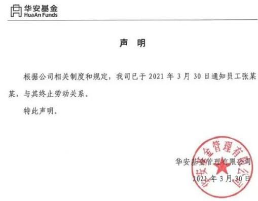 3月30日晚10点25分,华安基金发布声明称,根据公司相关制度和规定,我司已于2021年3月30日通知员工张某某,与其终止劳动关系。