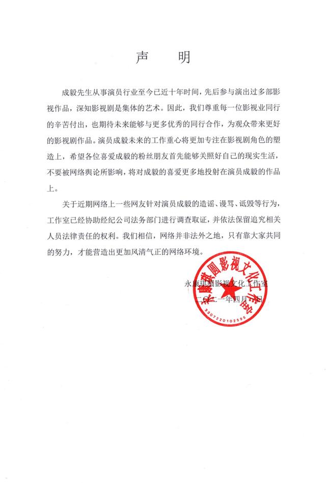 成毅工作室针对近期其相关舆论事件,发表声明。声明中称,关于近期网络上一些网友针对成毅的造谣、谩骂、诋毁等行为,工作室已经协助经纪公司法务部门进行调查取证,并依法保留追究相关人员法律责任的权利。