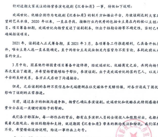 4月2日,杨紫工作室微博联合欢瑞,优酷两方联合发布了一则声明,声明中提到,2020年时,杨紫因为档期的原因拒绝了《沉香如屑》剧组和制片方的邀请,但可能因为档期的临时变化,杨紫方又在该声明中表示,今年将会参加该剧的拍摄,对于这个比较大的反转,网友们的推测可谓天马行空,众说纷纭。