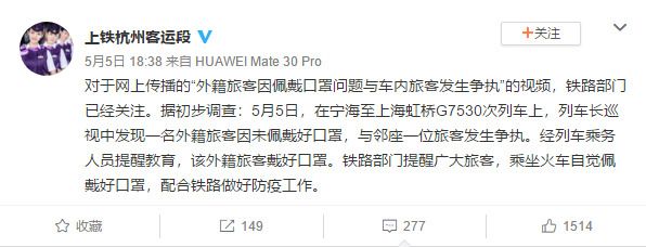 5月5日晚间,@上铁杭州客运段 微博发布消息称,对于网上传播的“外籍旅客因佩戴口罩问题与车内旅客发生争执”的视频,铁路部门已经关注。